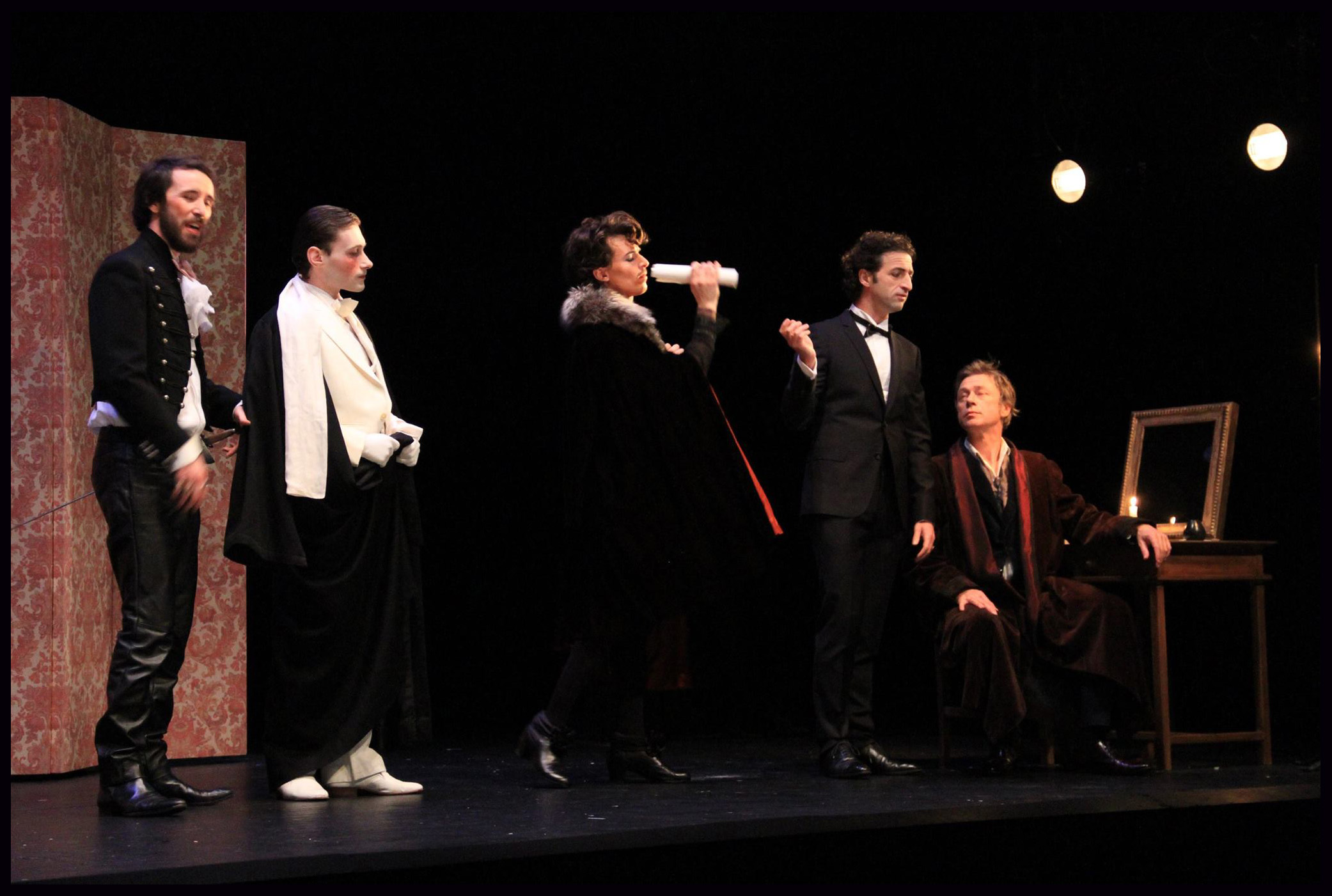 C’est toute la force de la pièce, le talent de ses comédiens. Si la scénographie et les décors sont sobres, c’est pour laisser place à la puissance théâtrale des interprètes. Félix Beaupérin, dont nous n’ignorons plus rien de la plastique parfaite et du rebondi du fessier, incarne un fringant Michel Baron espiègle, joueur et libertin. Hervé Lassïnce se glisse avec malice, vice et drôlerie dans le rôle du très gay Chapelle. Frédéric Quiring, dont le jeu est tout en délicatesse et doigté, est un épatant Lully à la fois ambitieux et mélancolique. En toute honnêteté, c’est le magistral Alain Marcel, qui survole la troupe. Son interprétation du fantôme de Cyrano de Bergerac est jubilatoire, drôle, caustique et sans concession pour ses congénères qui ont vite fait de s’étriper sur le dos de Molière pour le vider de sa substantifique moelle, de sa renommée et de son argent.