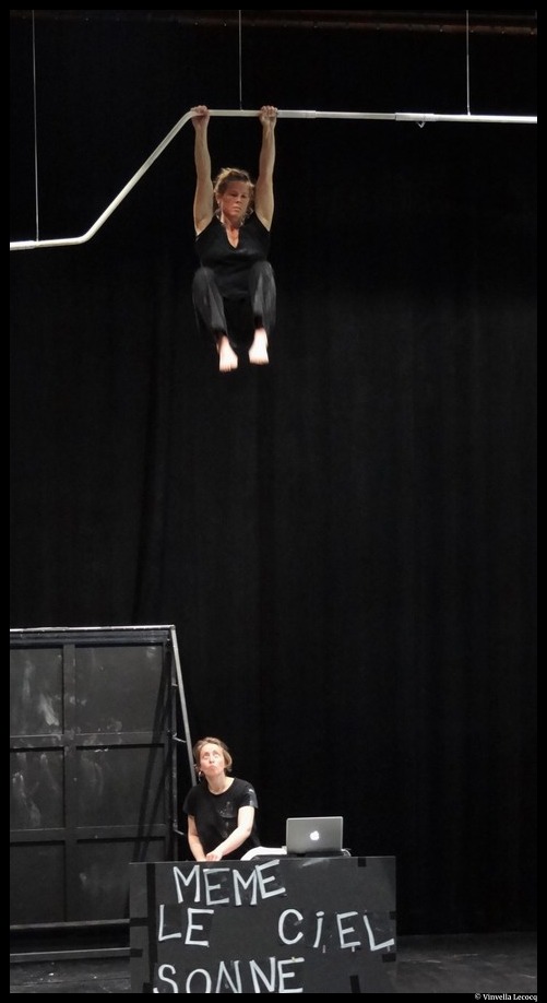 De son côté, Carla Pallone se dirige vers une table de mixage. Elle vient souligner les gestes de la danseuse-circassienne par une musique poétique, envoûtante. Par touche, les deux artistes esquissent une histoire, une fable extraordinaire, fantastique matinée de réel. Modifiant l’espace de jeu, transformant le vide en une page blanche sur laquelle, elles dessinent des lignes qui se brisent avant de se rejoindre, des bonhommes qui semblent danser et qui au fil du récit laissent place à des oiseaux.